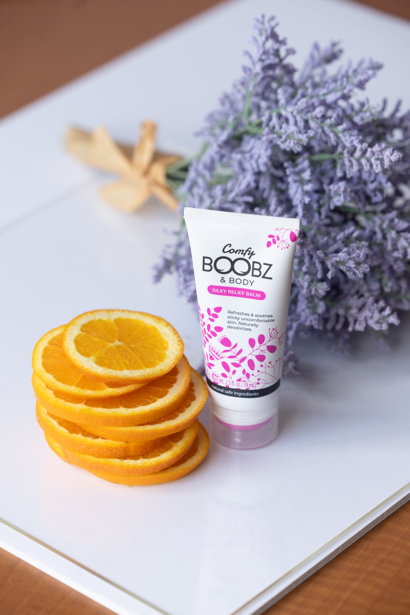Comfy Boobz is a chemical-free body care product made with natural ingredients for safe and effective results. It includes ingredients like sweet orange, tangerine, sage, lemon myrtle, lemongrass, cocoa butter, grapeseed oil, aloe vera powder, arrowroot powder, and zinc oxide for absorption, skin soothing, and protection.
